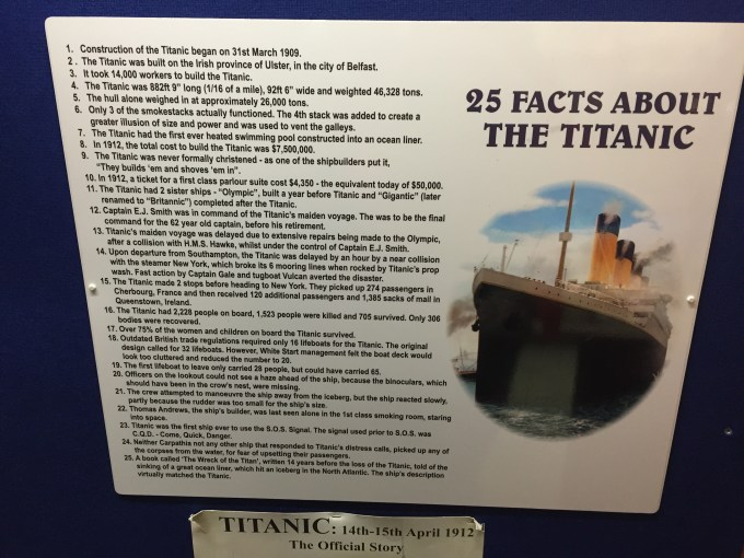 Today we visited this centre in Charlestown. It was very interesting & includes a display of articles from the Titanic. I was hoping there’d be some mention of my 2nd cousin (I think that’s right – maybe 3rd), Frank Couch, who was a crewman on the Titanic, was drowned & is buried in Halifax, Canada. He was Margaret’s great uncle. There is some info on online but I thought there might be more in this display since he was a local boy. But disappointing