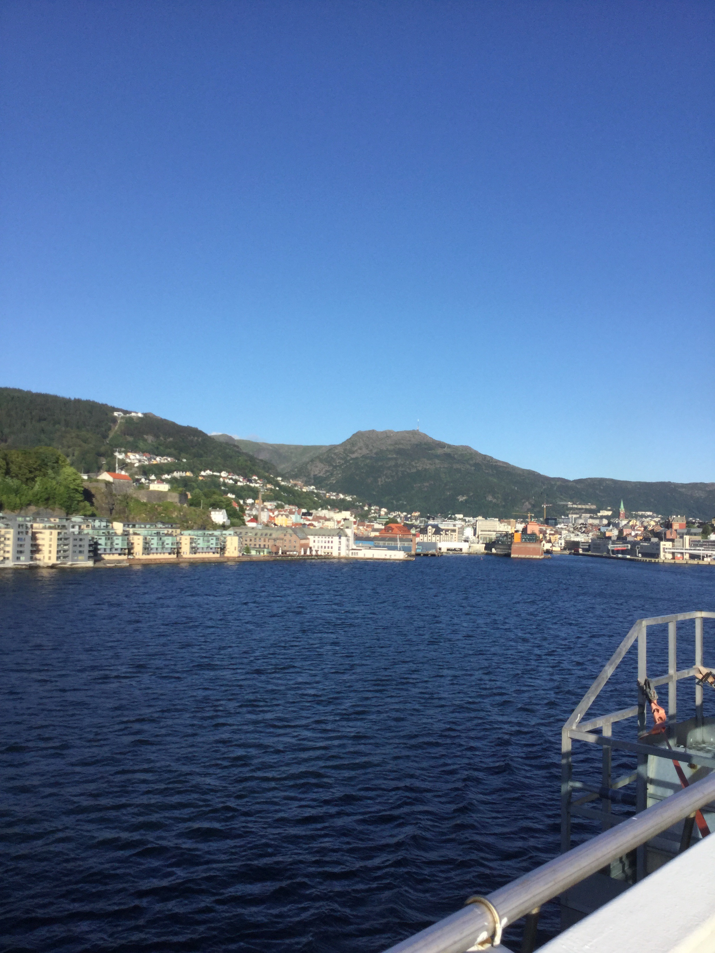 We’ve unpacked in our cabin, stowed everything away & we sailed at 8. Here’s a couple of views of Bergen as we left. It is, of course, bright sunlight now at 8:35pm. The maximum today was 15°. Snow still sits on the mountain tops. Very beautiful.