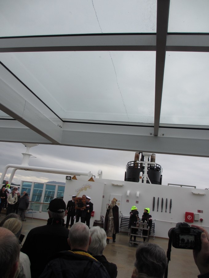 This morning a celebration was held on deck to celebrate being in the Arctic circle (We’re in the circle for 4 days) & King Neptune visited. People who were silly enough to allow themselves to be baptised by having iced water put down the inside of their shirts were rewarded with a free shot of something Norwegian & alcoholic. We stayed well away.