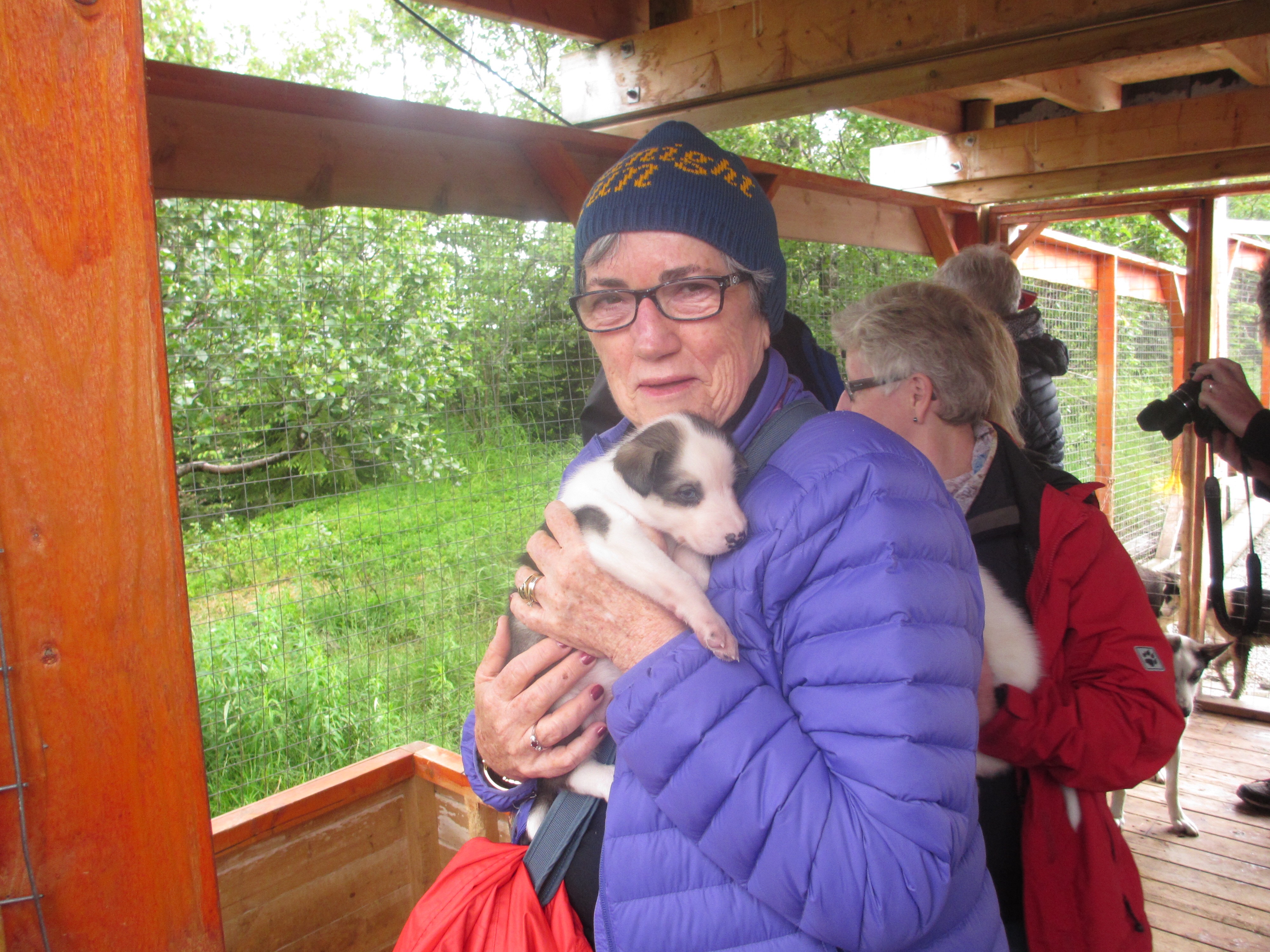This afternoon we went on an excursion into the countryside from the lovely city of Tromso to a place where you can go sledding with a team of huskies if you visit in the winter. The dogs are very friendly & love people & the puppies are georgeous. We could hold a pup – they were one month old. The woman who owns the place, Tove Sorensen, has raced in the famous Alaskan race, itidarod, in 2006. She has written her story; apparently it is an inspirational story. One of the other Aussies has read it.