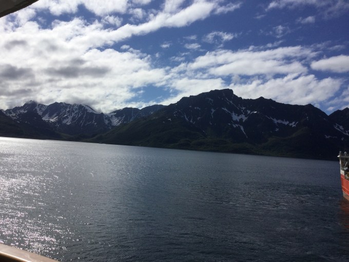 It is after 10pm. We’ve had dinner & are sitting up at the front of the boat in a closed-in area reading our books, drinking tea & watching the little farms at the base of the snow capped mountains slowly glide past. It could be 10 am at home. It’s so very bright & sunny. We’re so lucky to see this.