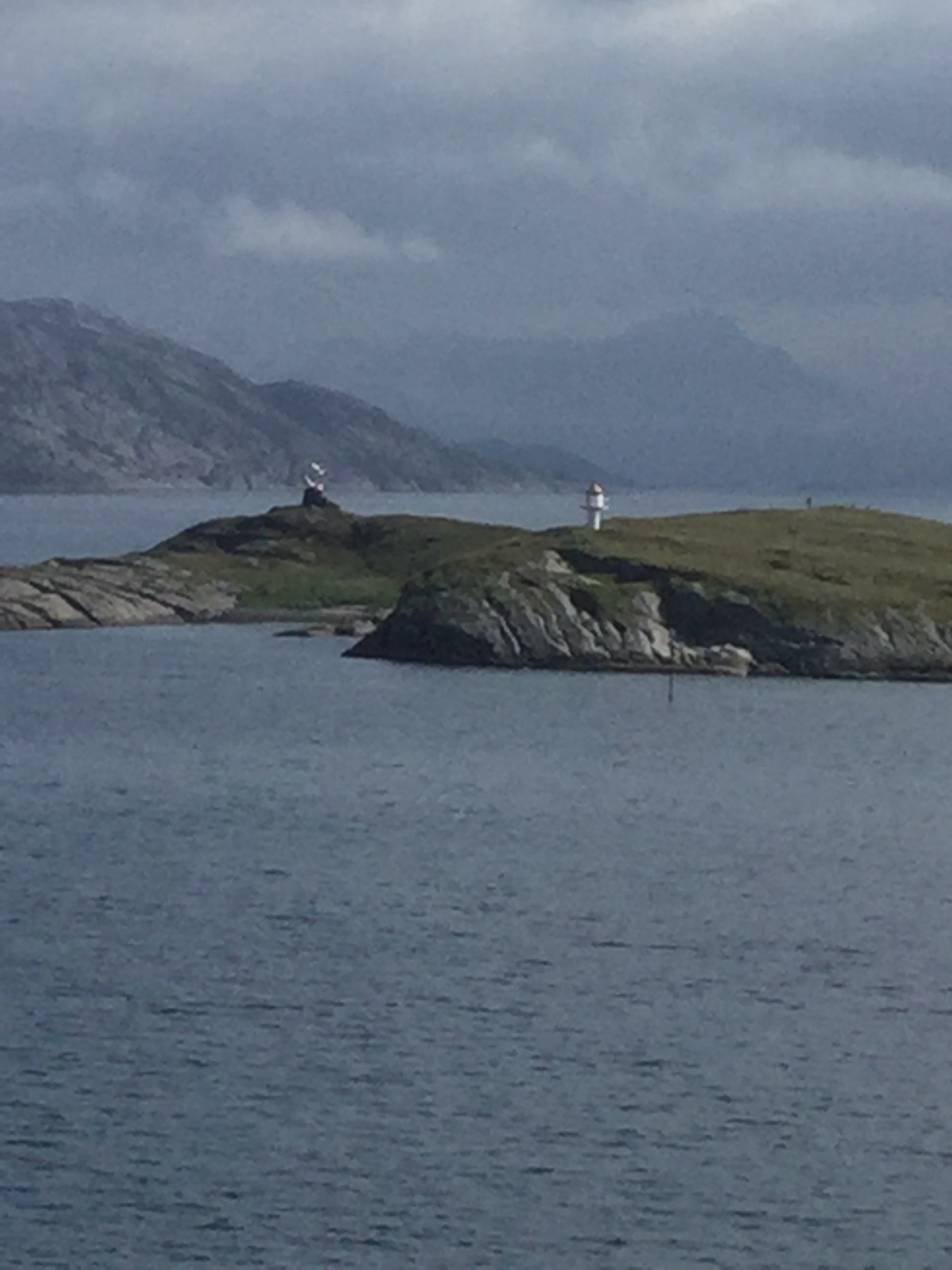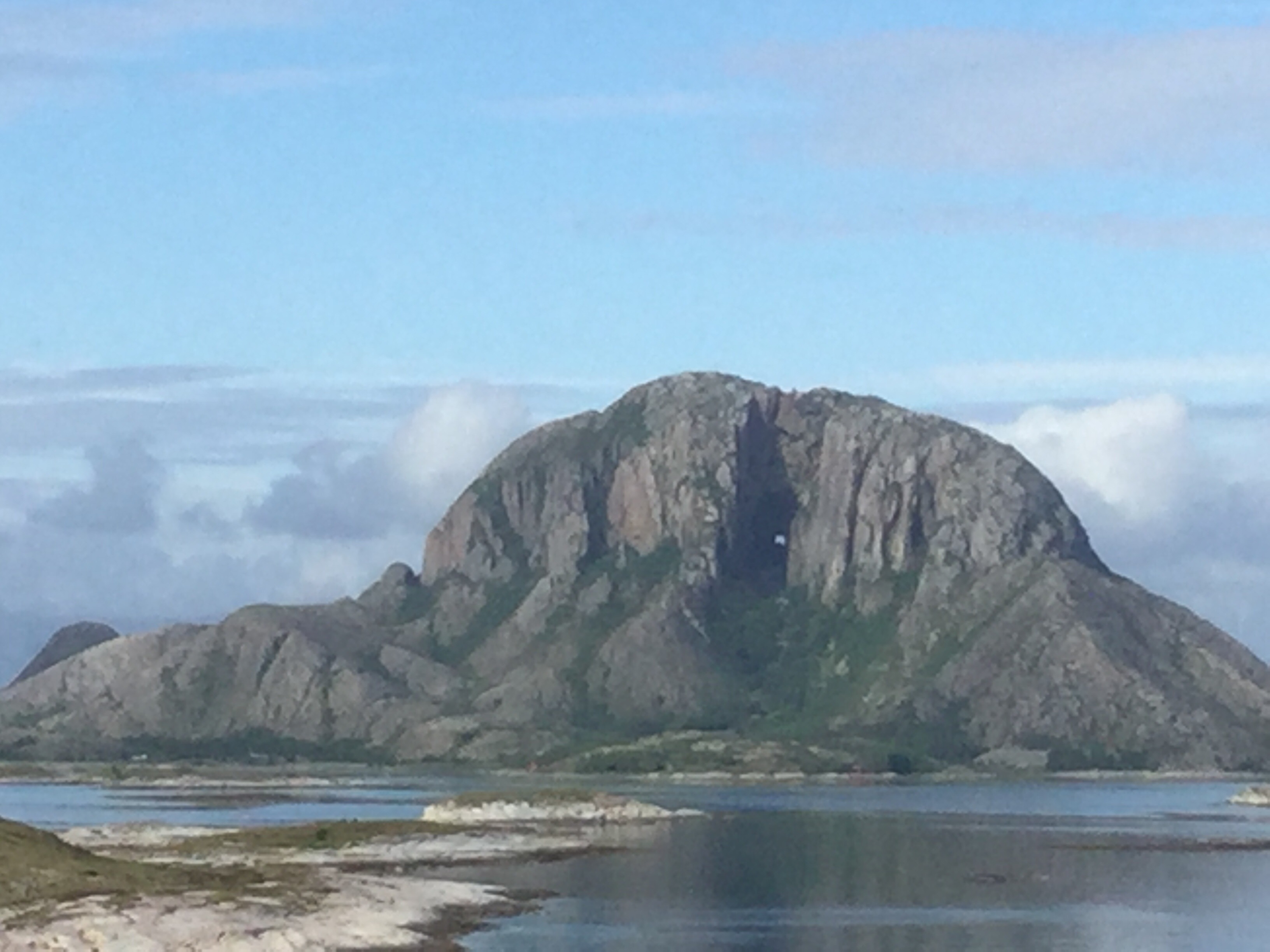 This afternoon the Captain took us close to Torghatten Mountain so we could see the big hole in it. It is 160m long, 25m to 30m high & 12 to 15m wide. The Norwegian fairy tale explains the hole says that Hestmannen’s arrow whisked through the Bronnoy king’s hat long ago when Lekamøya fled south. (If you want to know the whole story, I suggest you google it.)