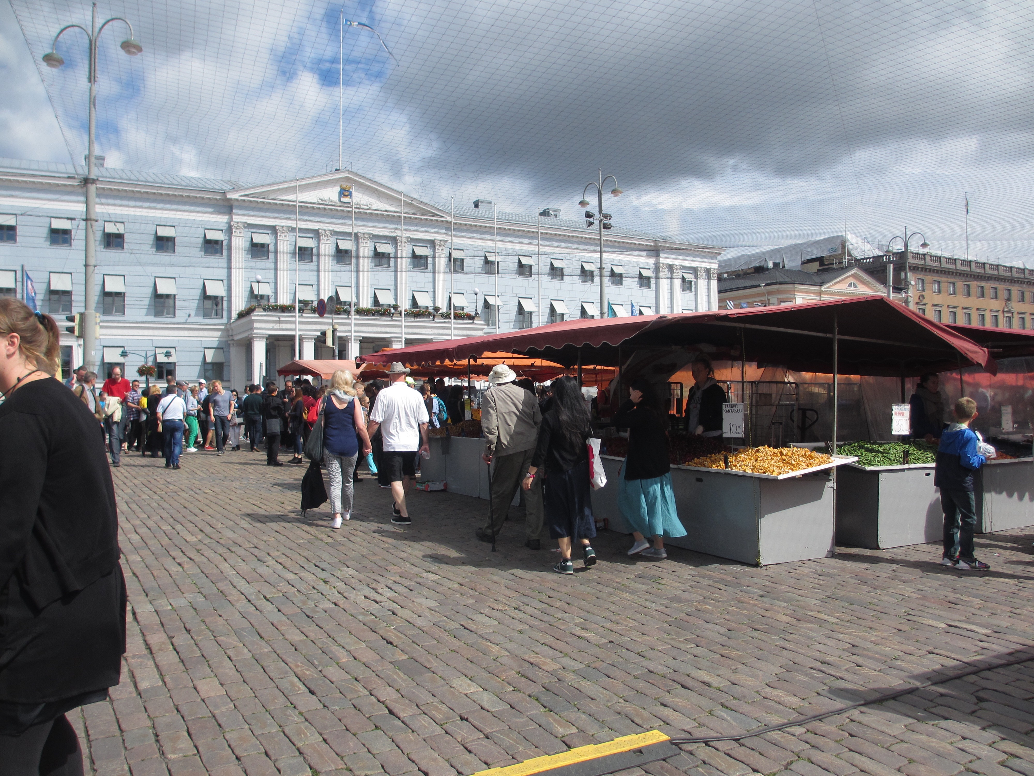Helsinki is surrounded by water on 3 sides & overlooks the Gulf of Finland & the Baltic Sea. We loved the fish market, very similar to the Bergen Fish Market – lots of delicious looking fresh berries, peas & potatoes – made us wish we had an apartment & could stay a while: (In the background you can see the lovely building which is the city hall).