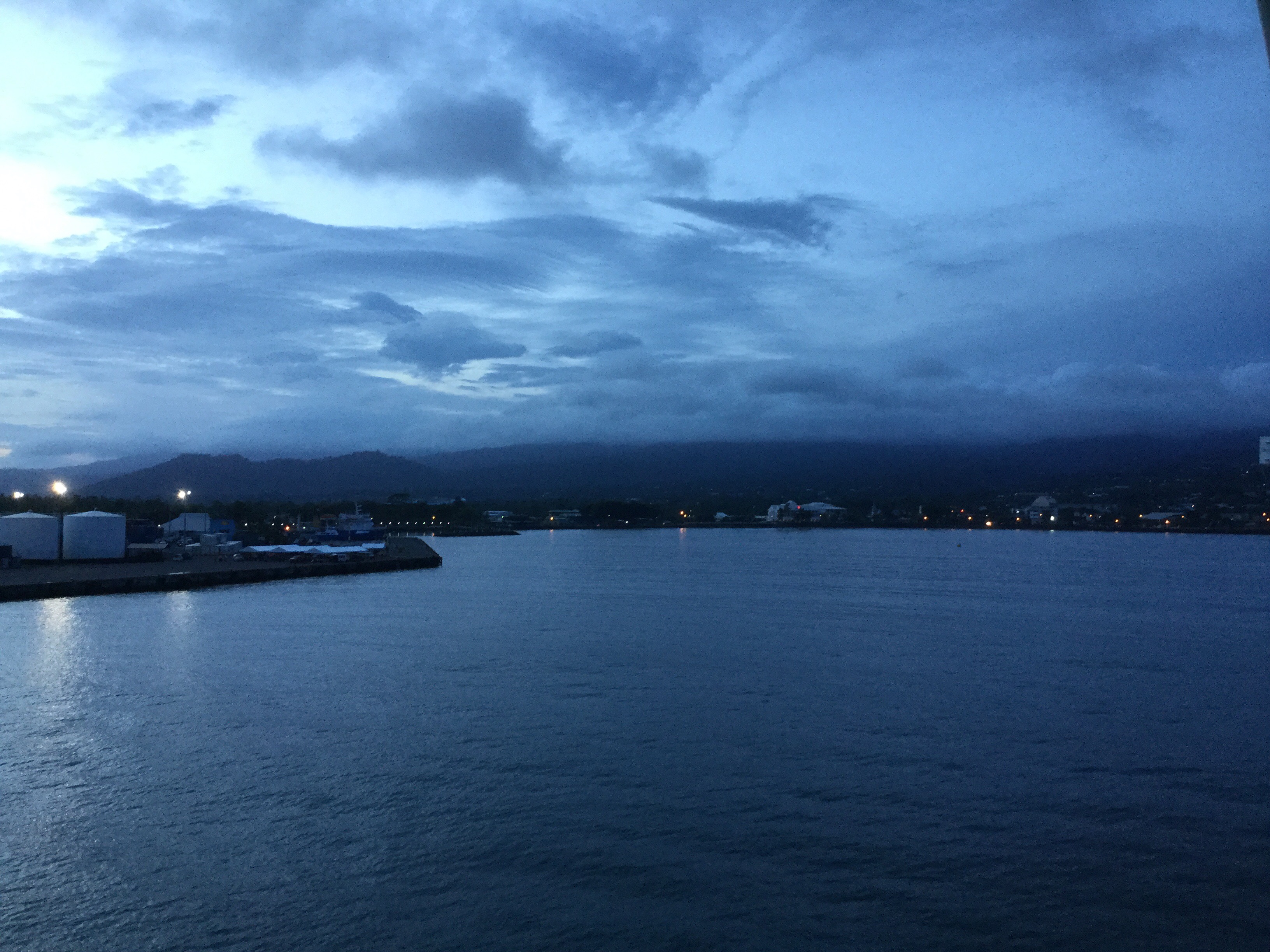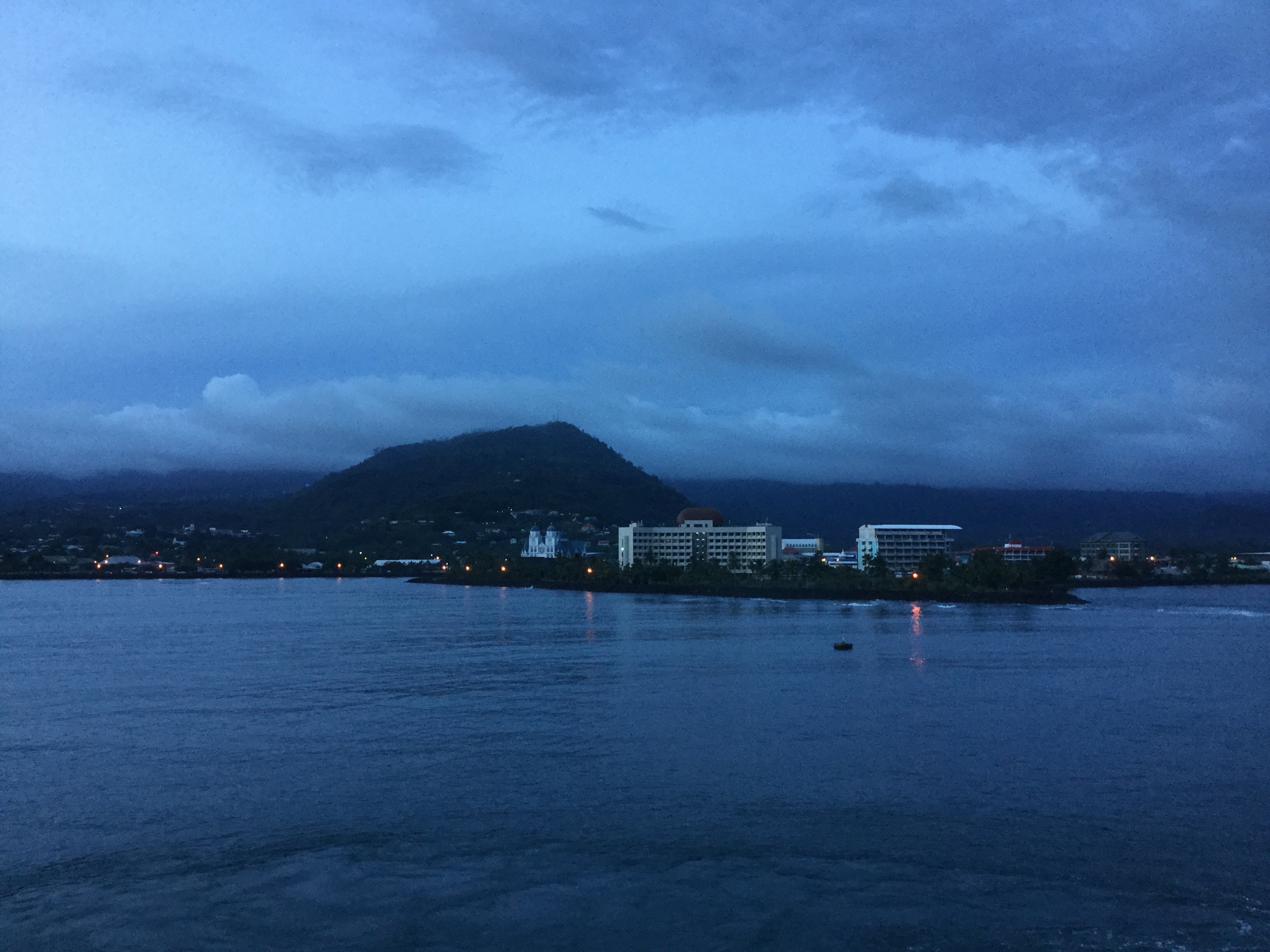 Last night we sailed the short distance to Samoa & once again it was a bumpy ride but we’re quite used to it now. While we were sleeping, we crossed the International Date Line & lost Wednesday so now we are the same day as you at home.  We came into Apia this morning as the sun was rising & it was very pretty.