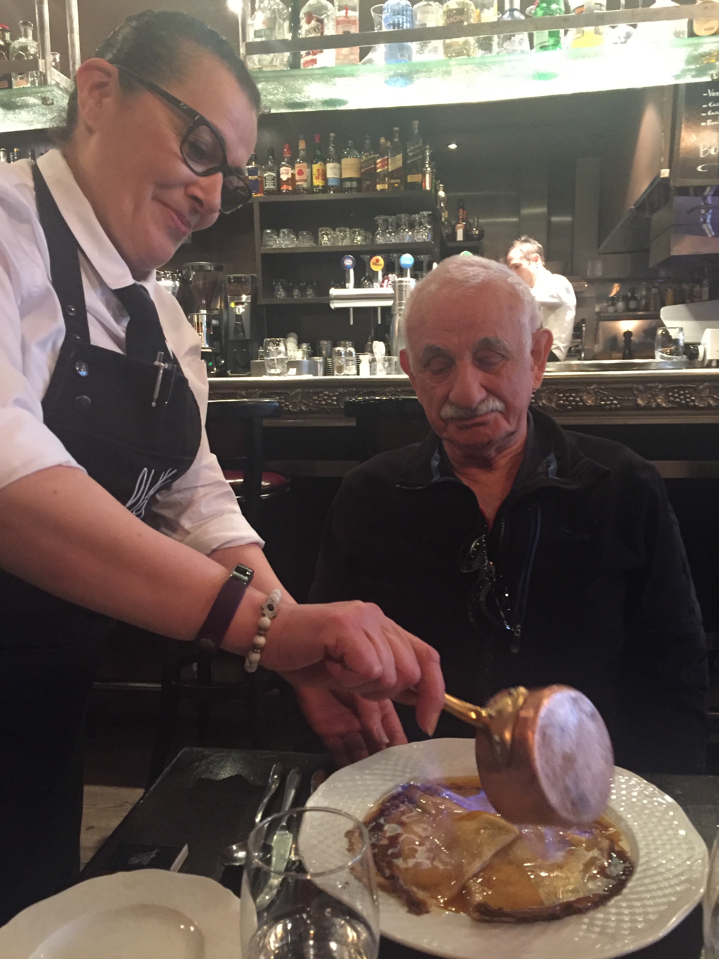 We wandered off and found lunch at a restaurant called ‘Flottes’. The staff were so friendly and were having so much fun, laughing and joking with each other, that it made it a very pleasant experience. It was obviously an old restaurant and was very busy. David ate moules et frites and I had a salmon, mango and avocado salad. For dessert David went for a little drama with crepes Suzette while I had my old favourite, rice pudding.