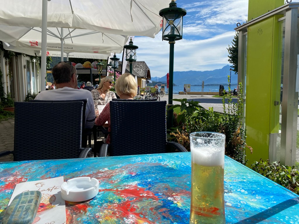 Magnificent scenery as we drove through the Austrian Lakes District.Everything is so green and lush.A lovely lunch spot at St Gilgen beside Wolfgangsee.St Gilgen – a really pretty place. Views as we cruised across the lake. The boat was fully loaded. Beautiful chalets and little villages were scattered beside the lake. The church where the wedding of Maria & Captain Avon Trapp was filmed for The Sound of Music. Inside that church in the town of Mondee