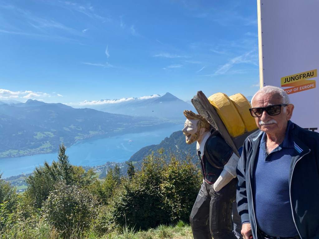 We then caught the funicular up to Harder Kulm which is 1323 m above sea level. It took about eight minutes to reach the top and seemed to go straight up. We had a perfect day for it! Actually the weather has been wonderful the entire time. We had lunch at the restaurant there – a burger for David and fish and chips for me – both true to form. Both very nice.