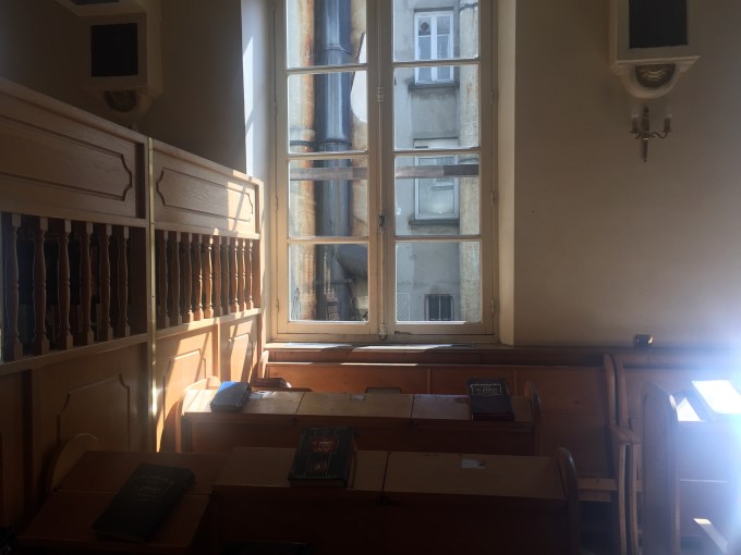 We were permitted to enter this synagogue which was used by Jewish people during World War II when they were not allowed to worship under the Occupation of the Nazis. It was a secret synagogue and is still used today. A young man was there studying the Torah.